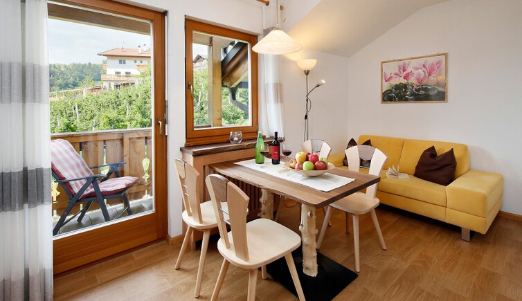 Die hellen und komplett ausgestatteten Ferienwohnungen sind im Wohlfühlstil eingerichtet und bieten einen herrlichen Ausblick Richtung Meran, Schenna und Dorf Tirol.
