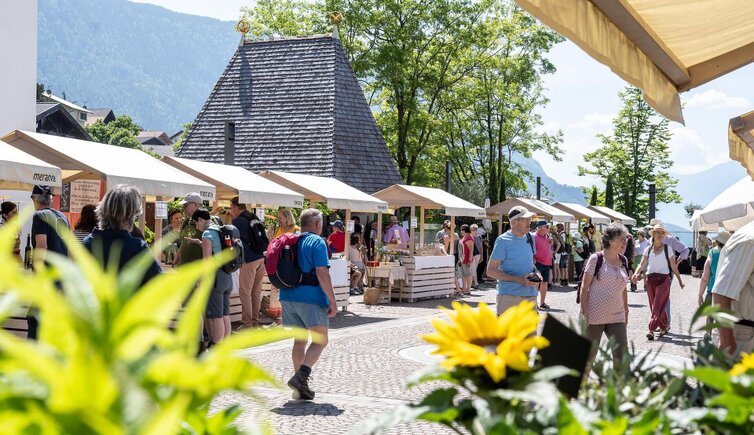 Beim Schenner Dorfmarktl auf dem Raiffeisenplatz bieten die Aussteller ihre hofeigenen Produkte (Käse, Wein, Honig, Krapfen u.a.) zur Verkostung sowie lokales Kunsthandwerk zum Verkauf an.
