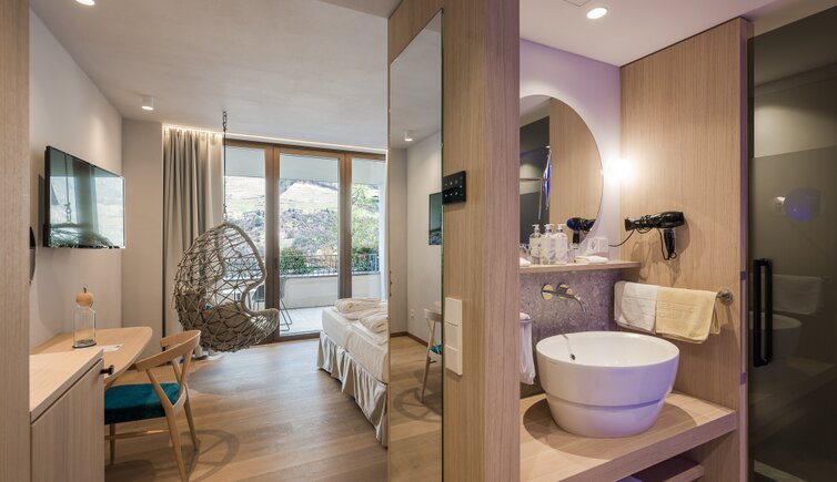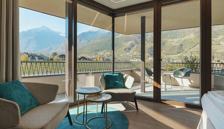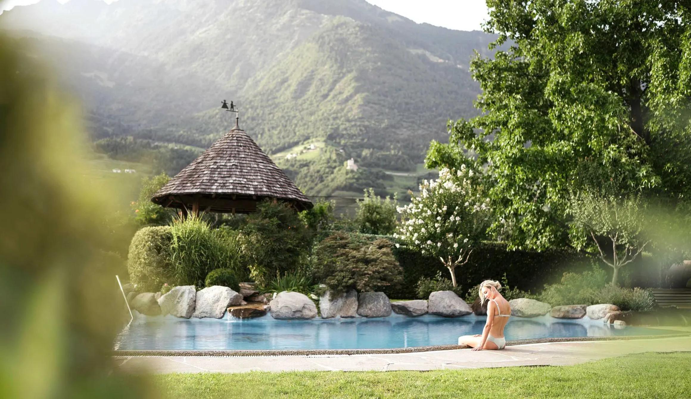 Der kleine Garten Eden: Vom Naturstein-Freibad mitten in einer gepflegten Gartenanlage, Hallenbad, Saunawelt, Ruheraum, Dachterrasse und Fitness bis hin zum idyllischen Privatspazierweg durch Obstgärten finden Sie hier alles, was gut tut. Das Zentrum von Meran erreichen Sie übrigens bequem per Bus (Haltestelle direkt am Hotel).