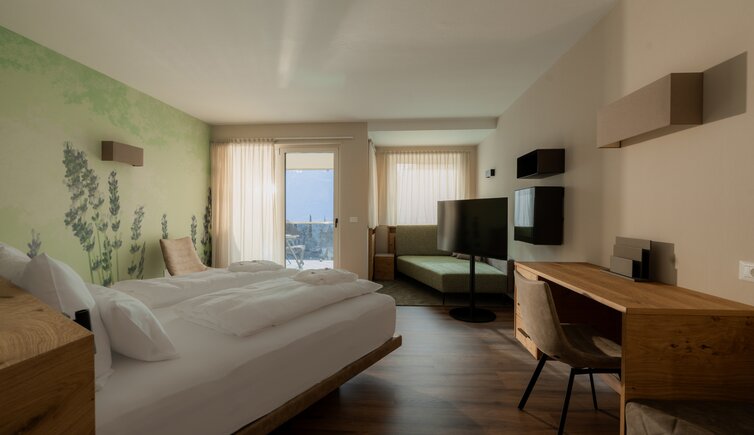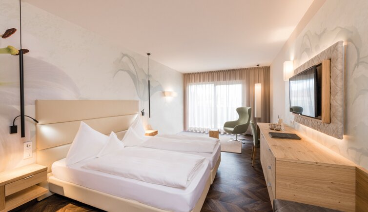 The hotel’s rooms and suites are named after flowers and offer both harmonious colours and timeless furnishing. From here you can enjoy an awesome view on the surroundings of Merano.