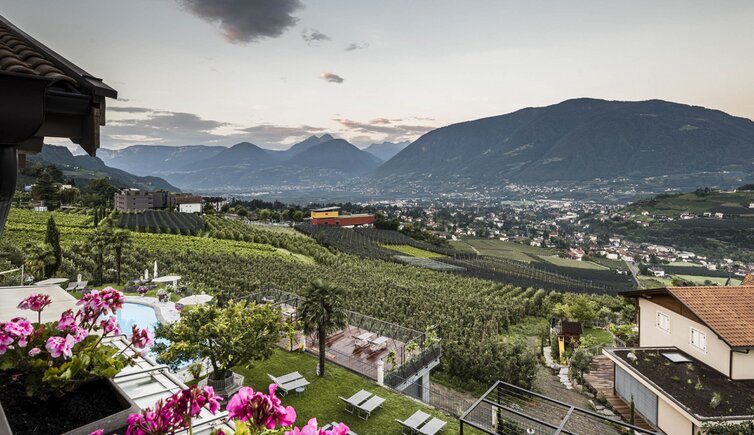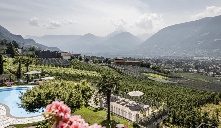 Southern flair, Mediterranean oases of peace, the panoramic outdoor pool, the heated outdoor whirlpool, the sunny location with a wide panoramic view amidst vineyards and orchards and surrounded by the impressive backdrop of the Merano mountains: