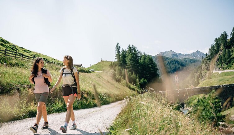 Dal ponte sulla strada del Passo del Rombo in fondo alla Val Passiria iniziamo il cammino lungo l’alta via “Tiroler Höhenweg“ in lieve salita attraverso il bosco. L’ultimo tratto sale, conducendo lungo piccole serpentine fino alla miniera Monteneve. Ci fermiamo per la pausa, dove consumiamo il pranzo a sacco che preghiamo di portarsi dietro. Poi raggiungiamo la malga “Obere Gostalm” e torniamo alla strada per il Passo del Rombo.