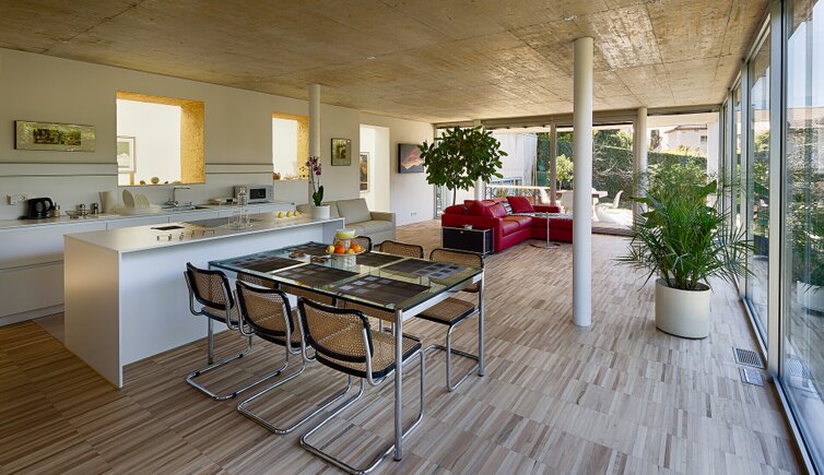 Nell’appartamento dai soggiorni completamente vetrati, l’immersione nella natura circostante è rilassante.